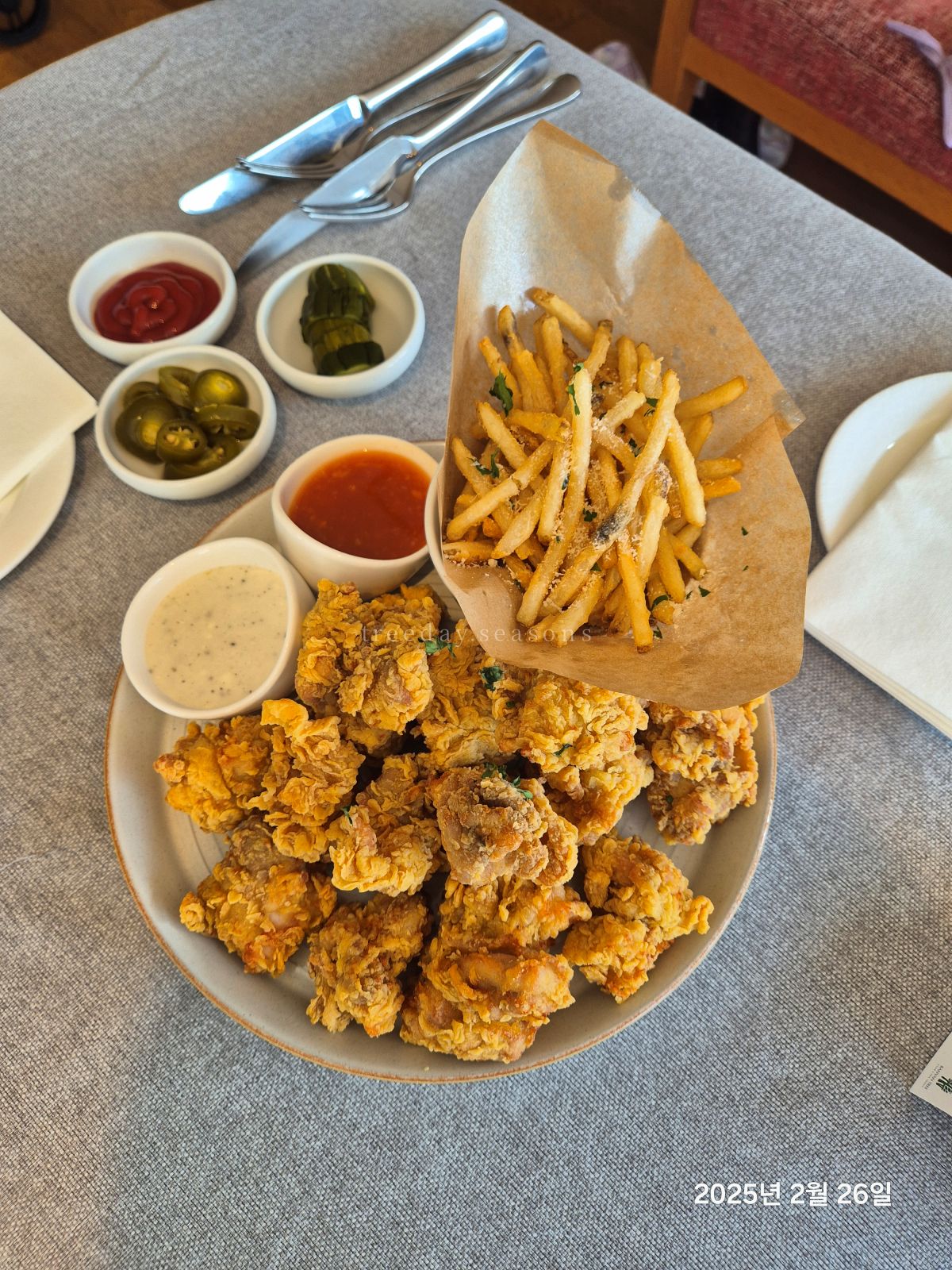 감자튀김, 치킨소스 2가지, 할라피뇨, 피클, 케찹.