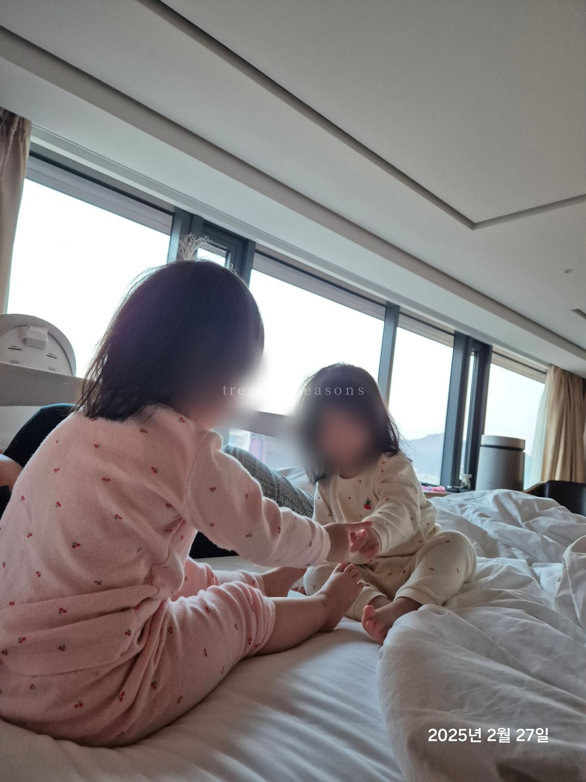 호캉스는 물놀이가 8할인데 아무 때고 물에 뛰어들 수 있는 점도 정말 좋았다. 아이들 데리고 수영장으로 이동하는 게 보통 일인가. 또 물놀이 앞뒤로 여아 둘을 엄마 혼자 감당해야 하는 부담도 없다. 감기 걱정 없는 건 덤!