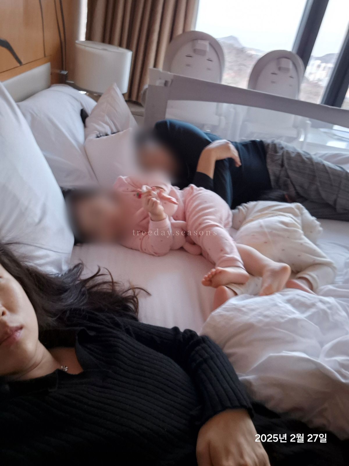 방 안에 온수풀이 있어 수시로 물놀이할 줄 알았는데 막상 그렇지 못해 아쉬움이 남았다. 아이들과 물놀이가 생각보다 체력이 소모됐고, 얕아도 물 속에선 아이들에게 온 신경을 집중해야 했다. 또 물놀이 마치면 씻기고 말리고 일이 많은데 한 번 하고 나니 진이 쪽 빠졌다. 뒷수습 다 마쳤는데 또 뛰어든다고 할까봐 조마조마한 마음도 들었다. 아마도 아침부터 쉼없이 움직여서 너무 피로했던 것 같다. 엄마는 그저 눕고 싶었어.