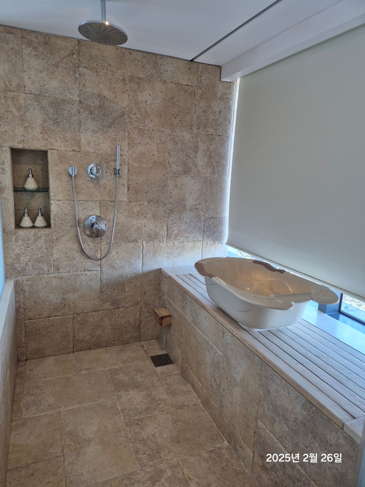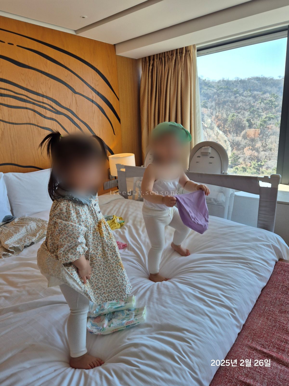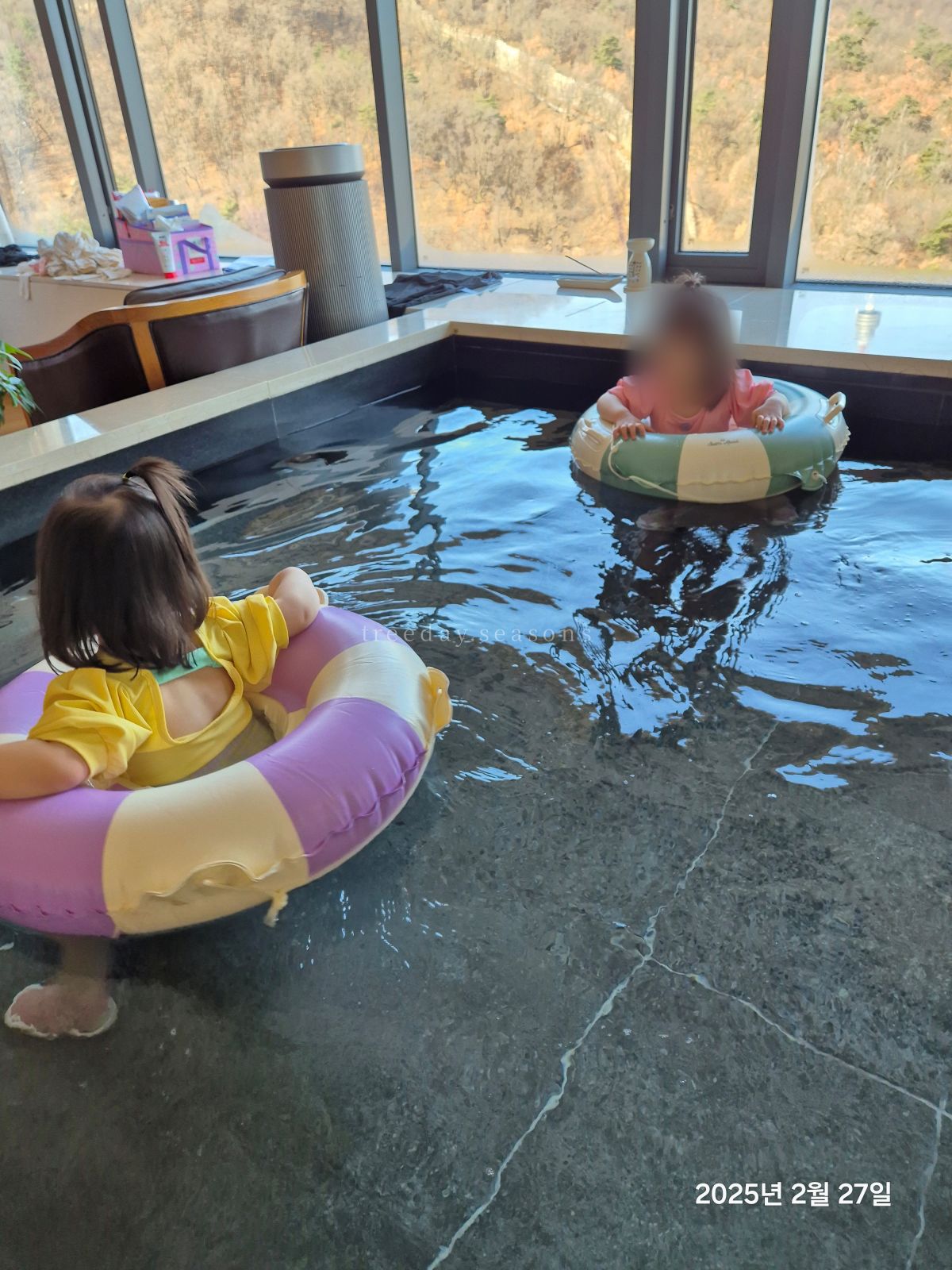 물론 단점도 있는데 입실할 때 방문을 열자마자 후끈후끈 습한 공기가 훅 끼쳤다. 방에 온수풀이 있으니 가끔 공기가 답답했다. 창가 커튼을 들추면 곰팡이가 보였고, 아침엔 밤새 차가워진 바깥공기에 창문과 창가에 물기가 흥건하게 맺혔다.(구조상 어쩔 수 없다 생각한다.) 또 물놀이 후 물기에 아이들이 넘어질까 노심초사 신경이 쓰였다.
