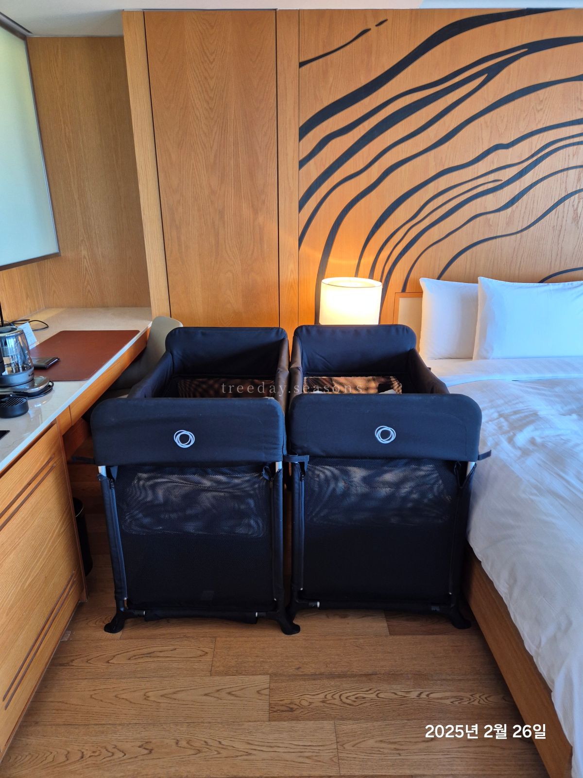 더블베드 왼쪽으로 부가부 아기침대 2개, 오른쪽에는 침대가드 1개가 설치되었다.